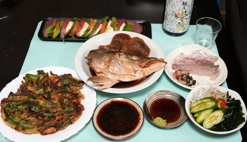 夕食はハマチとアボカドのカプレーゼ、真鯛の霜降造里とサザエの刺身の合盛、メジロの兜煮、シラスの酢の物、メジロ入りチヂミ
